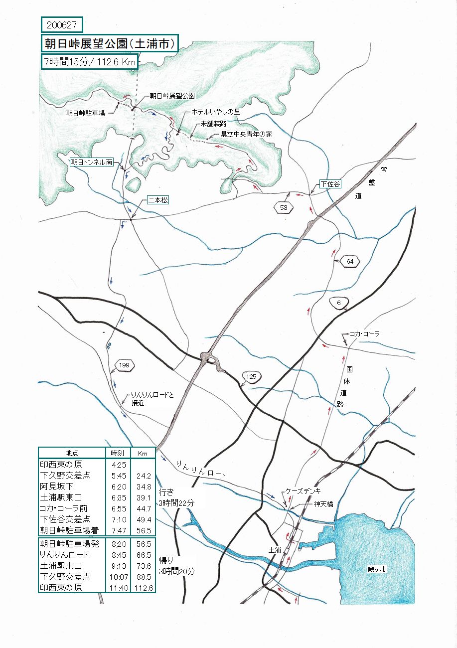 行きは土浦の神天橋から国体道路、県道64号、下佐谷、県立中央青年の家を経由して朝日峠に登りました。帰りはフルーツラ