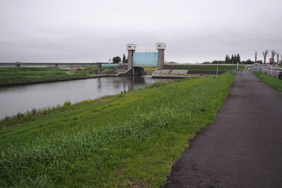 クリングロードは途切れます。水門部分を車道で通過すると、再びサイクリングロードは復活します。