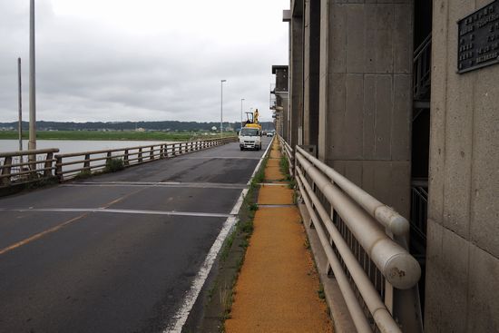 常陸川大橋を渡るには問題あり。車道は狭くて通行危険。歩道(上の写真で茶色の部分)も狭くて(90cm巾)、