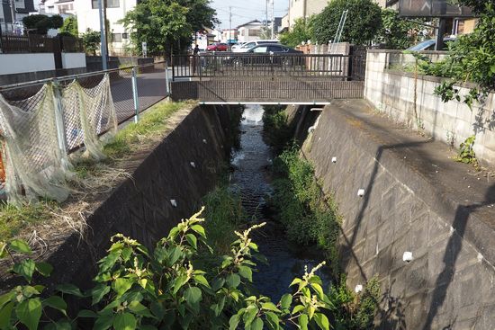 調整池から総武本線を越え、中央公園を過ぎ、手繰川源頭の住宅地に入ります。この小さな流れが