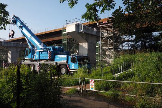 やがて前方に工事中の橋が現れ、その下を通過できません。なので急坂で橋と同じ高さまで登って、