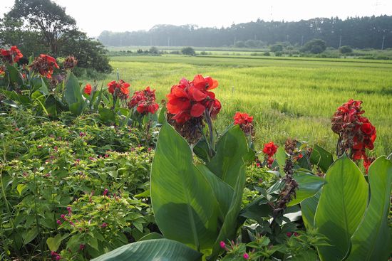 航空基地から藤ケ谷交差点で国道16号を渡り、手賀農免農道に降りてきました。路傍のカンナの