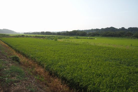 稲田の向こうの、黒く樹木が連なっているのが今井の桜です。金山落(かなやまおとし)沿いに2キロ