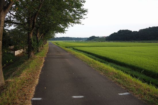 みのり幼稚園前から上流方向を見ています。田んぼの向こうの森が高崎自然の森です。