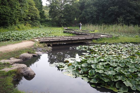 ここは「水辺の森」と呼ばれる区画です。水連の咲く池と木道があります。公園中央部に行くには、