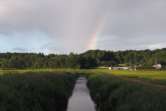 行く手にかかる虹はなかなか消えません。虹の背後に雨域があるようです。写真は鹿島川と虹。