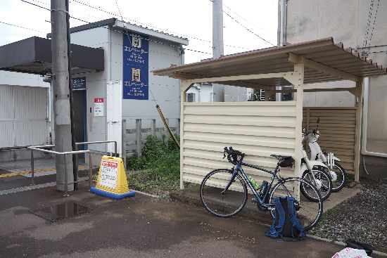 川間駅です。自転車を組み上げたところです。夜間に雨が降ったようで、路面には水たまりが残って