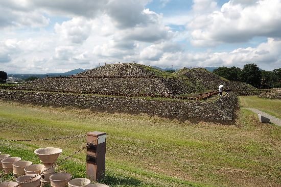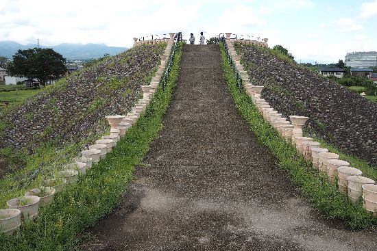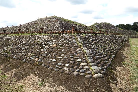 古墳に近づくと、その表面は葺石と呼ばれる丸石で覆われているのが見てとれます。中段には土器が