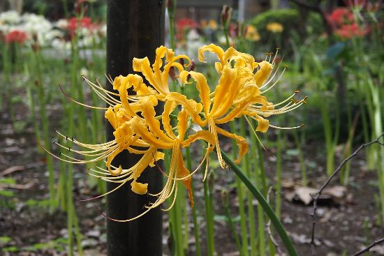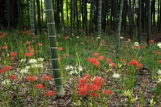 これは竹林に咲く彼岸花。ところで、「鬼滅の刃」の主題歌「紅蓮華」のバックに流れる映像は彼岸花です。