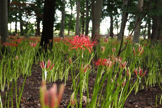 彼岸花の群落。今年は時期が早く、満開には至っていません。白い彼岸花が目立ちます。