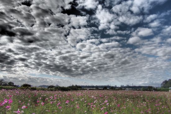 ひつじ雲 浮ぶ師戸の 広き野に 咲きて涯なき コスモスの花