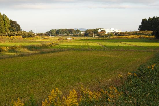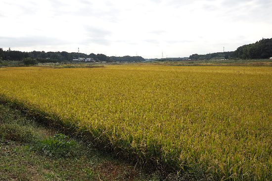西谷田川に出ました。ここも広々とした谷津です。まだ刈り取っていない稲田があったので、撮影。
