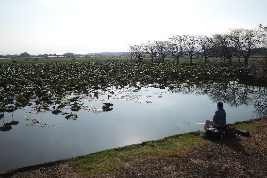 ルート途中にある金田池。この池の横を左折して、しばらく進むと、さくら運動公園の外周を走るように