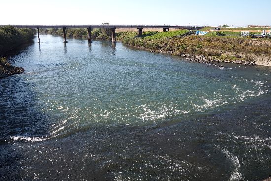 高橋大橋から左岸を進むと、前方を支流の旗川に遮られます。なので、旗川沿いに上流に進みます。