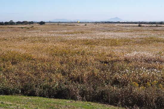北エントランス入口から広大な芦原(第一調整池)を眺める。画面中央、遠くに、今降りてきたばかりの