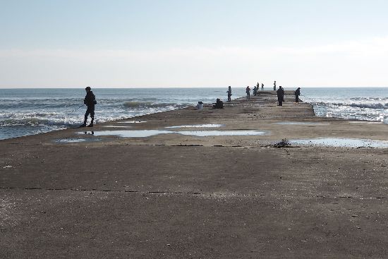 更に河口に寄って撮影。堰堤の上に人がいますが、皆さん釣り人です。平日なのに暇人がいるのですね。