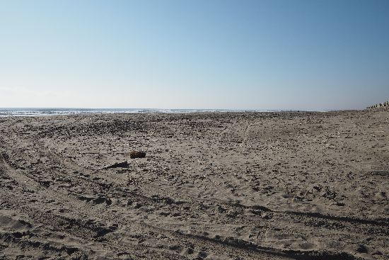 河口から右側(南西方向)の広大な砂浜。海には点々とサーファーが浮んでいます。