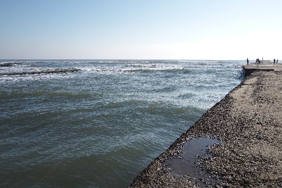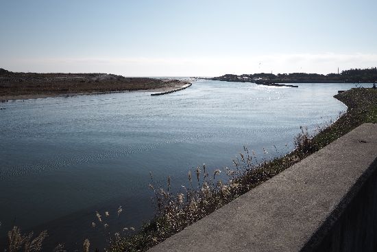 河口に着きました。白波がたっている先は、海です。