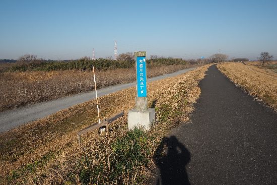 常磐自動車の下を通過して土手を進むと、「利根川合流点です。」という標識が現れます。ここから先は
