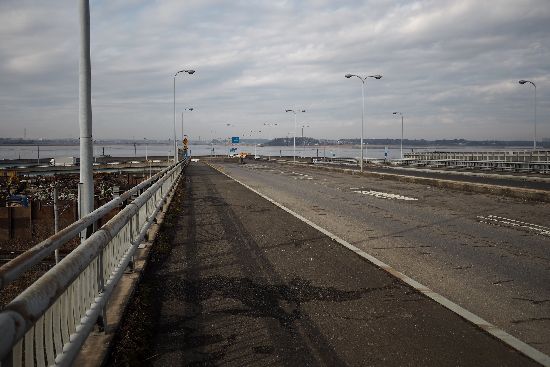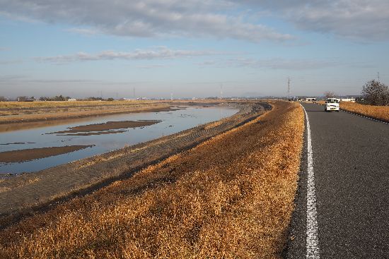 利根川を栄橋で渡り、小貝川左岸を北上します。戸田井橋たもとを横断するのは、通勤時間帯で車が