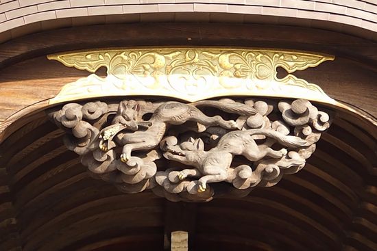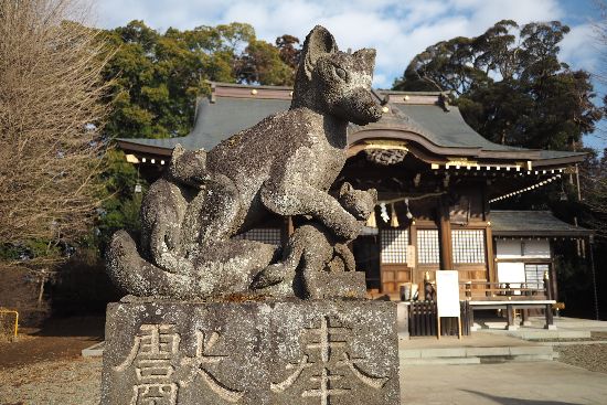 稲荷なので、本殿前にいるのは狛犬ではなく子狐を連れた狐です。なお、伝説によると、命を助けられた恩返