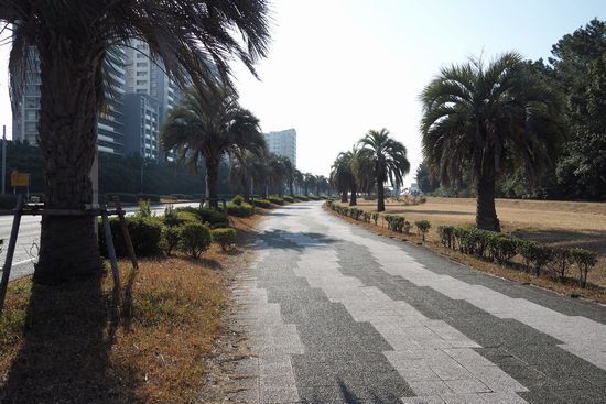 海浜幕張駅を通過し、海沿いの道にでました。ヤシの並木と広い歩道の景色は、外国のリゾートに
