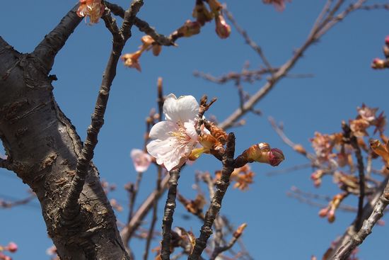帰途、新川の河津桜を観察しましたら、蕾はふくらみ、ちらほらと咲いている花もありました。春近し。