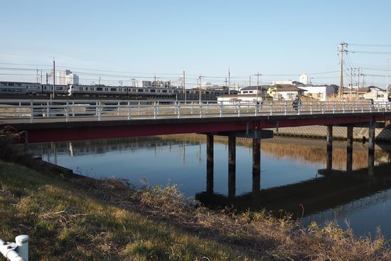 橋の向こうを総武線の電車が通過中です。手前の橋が浪花橋。ここを渡って、総武線の側道を進みます。
