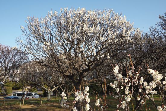 を500mくらいで梅林園に着きます。緩い傾斜地に150本の梅が植えられています。2分咲き。