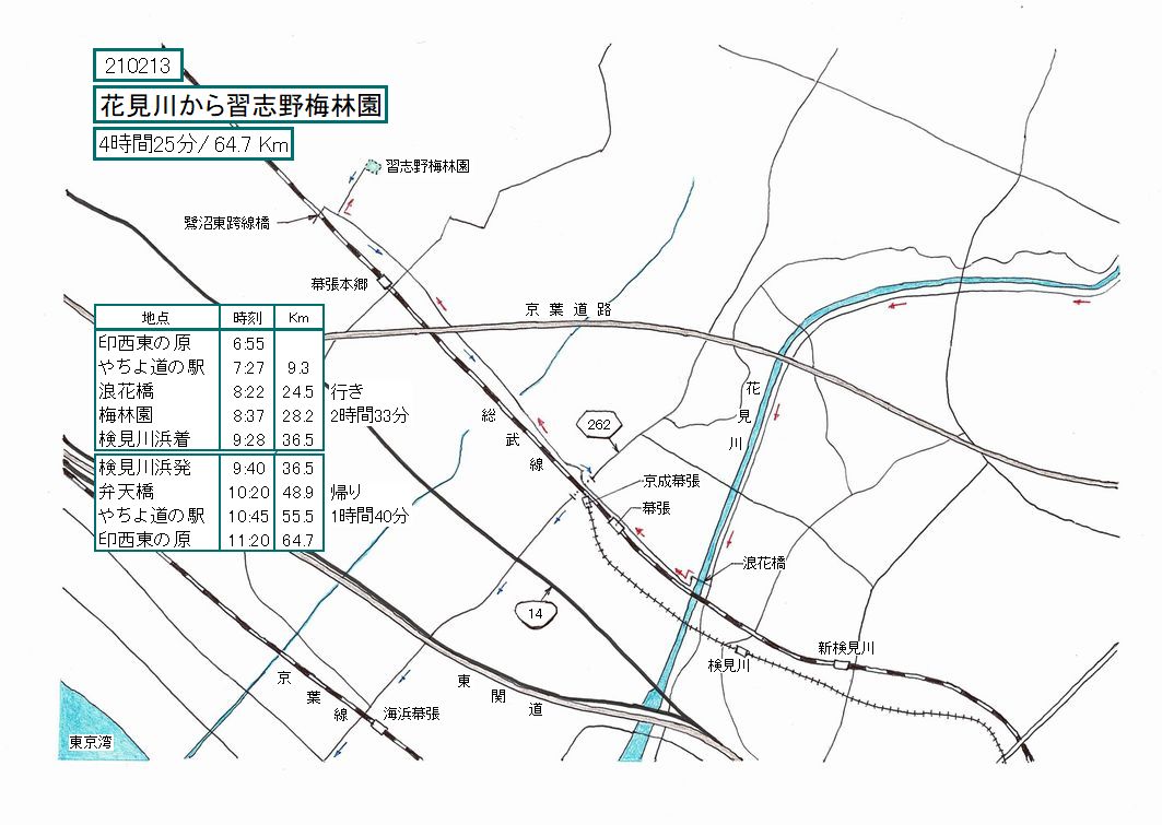 これは花見川サイクリングロードの派生ルートです。総武線の側道が走り易く、容易に習志野梅林園に到達できます。