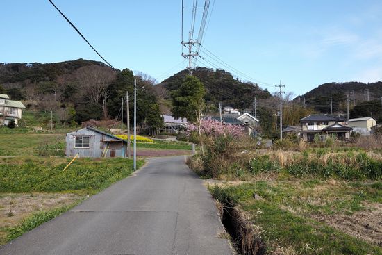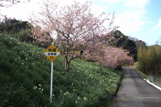 江月水仙ロードを下っていく途中の風景。水仙の大群落と河津桜ののコラボ。