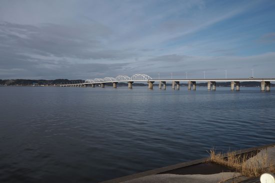 新神宮橋を過ぎて北を撮影。湖は細長いので常に対岸は見えています。長手方向には微かに北浦大橋が