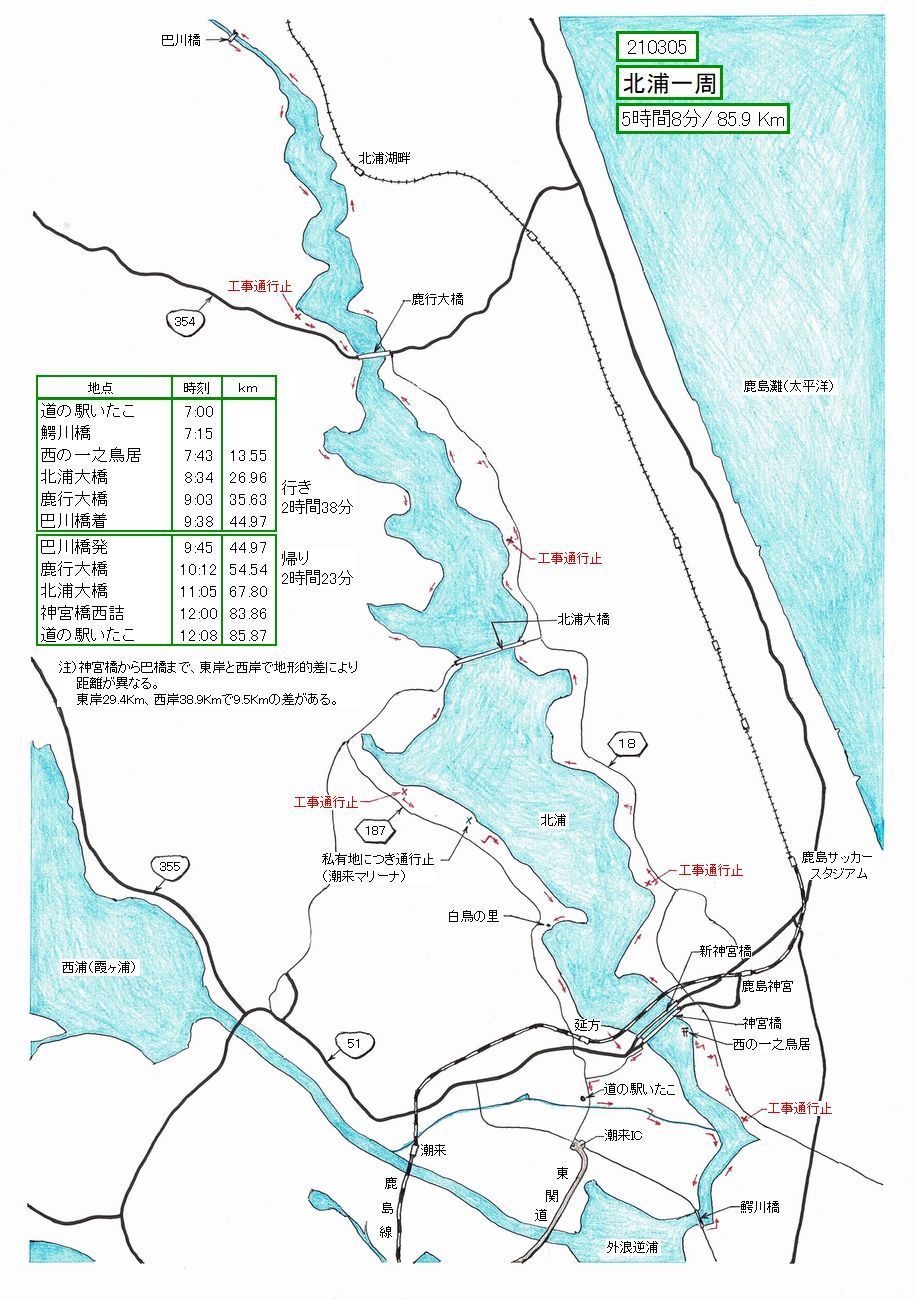 わち、この神宮橋が北浦と鰐川を分かつ管理境界なのです。今日は鰐川橋から周ったので86キロコースとな