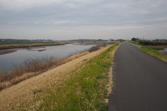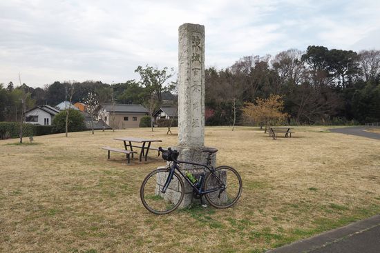 小貝川の土手に出ました。ここには「茨城百景・岡堰」の石碑があります。