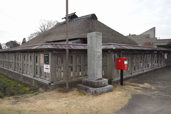 途中で土手下の道を行き、間宮林蔵記念館に着きました。藁葺の家は間宮林蔵の生家です。奥に