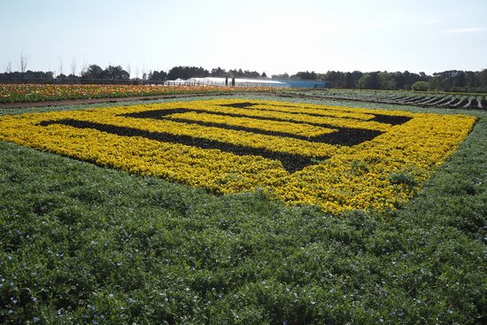 富田さとにわ耕園に着きました。黄色い花を取り囲んでいる緑の部分はネモフィラですが、まだ開花前