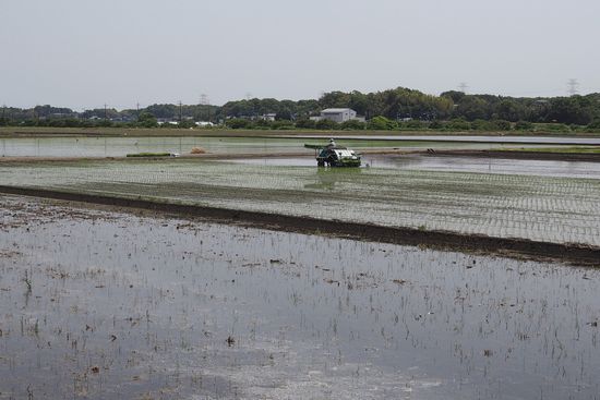 松崎工業団地から坂を下って、新川と神崎川合流部の広い水田地帯にでました。田植えが始まって