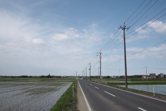 双子公園を経由して中央排水路と並行するまっすぐな農道を行きます。広々とした水田が両側に展開