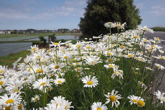 良い道です。土手にマーガレットの白い花が咲いていました。