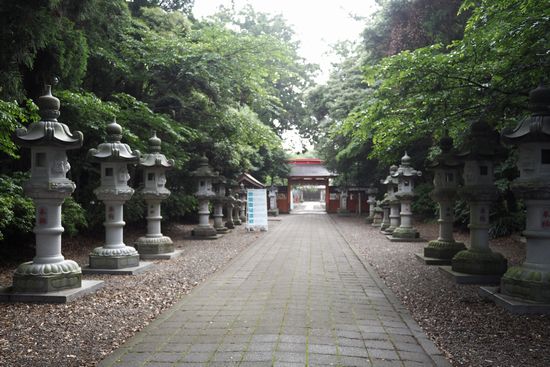 石灯篭の並ぶ参道の先に赤い神門が見えています。周囲は鬱蒼とした息栖の森です。