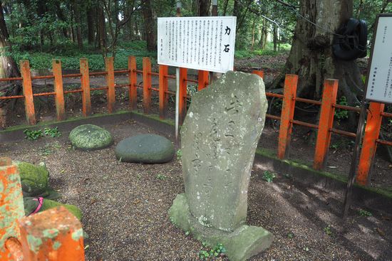 芭蕉の句碑と力石。