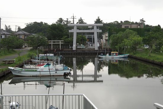 常陸利根川左岸を来ると、船溜まりがあり、その奥に息栖神社一之鳥居があります。左右に男瓶(おがめ)