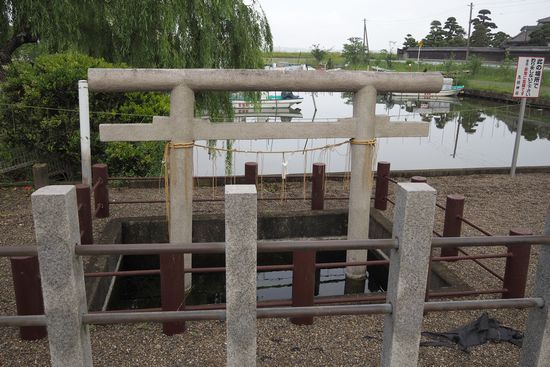 女瓶と鳥居の位置関係。二つの井戸を併せて忍潮井(おしおい)と呼び、日本三霊泉の一つです。