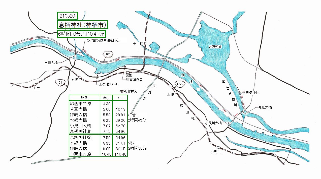 最後に、東国三社詣を自転車で一日で周れるか?と考えてみました。これは十分可能です。走行距離も140Kmくらいで収まるのではな