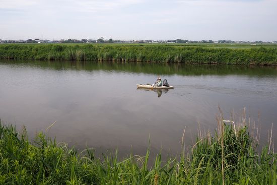 カヤックに乗った釣り人。楽しそうですね。黙って撮影しては失礼なので、一応、声をかけてから