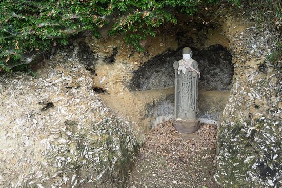マスクをした仏様が貝層の穴の前におられますが、この穴は古代人の横穴墓です。
