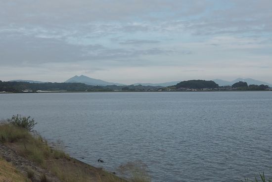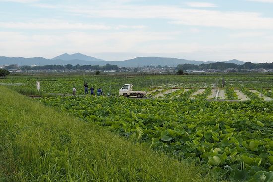 湖畔のサイクリングロードを東に向かいます。振り返ると、蓮田の向こうに筑波山が見えます。この