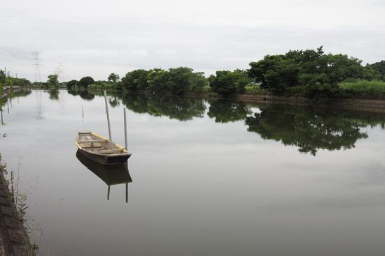 利根親水公園に続く貯水池。 もやった船が、画面のいいアクセントになっています。