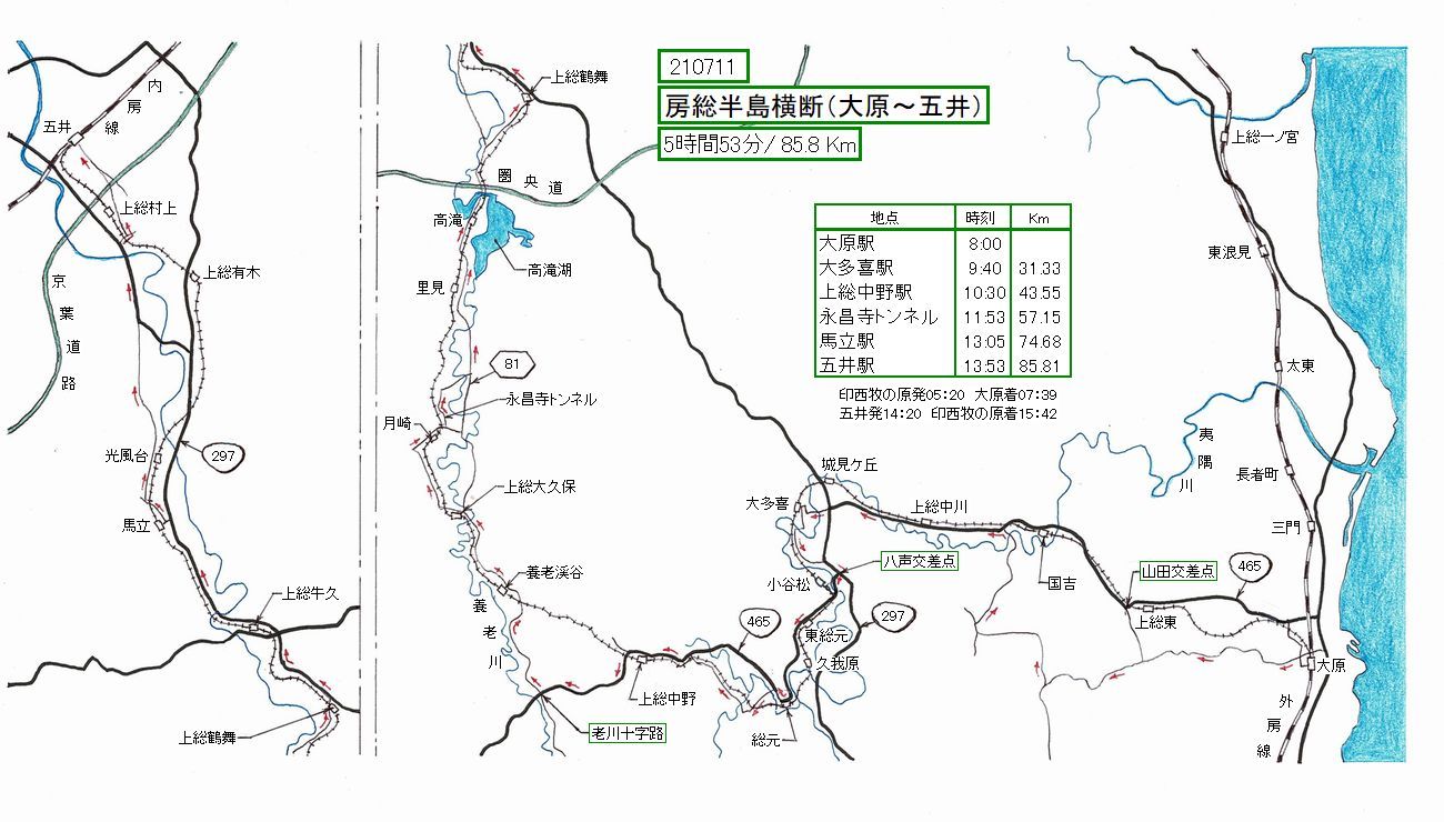 時間も参考になりませんので、予めお断りしておきます。なお、印西牧の原〜大原、五井〜印西牧の原は鉄道利用
