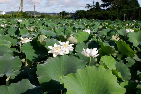 小野川沿いにも小規模ながら、蓮田があります。白い花が沢山咲いていました。
